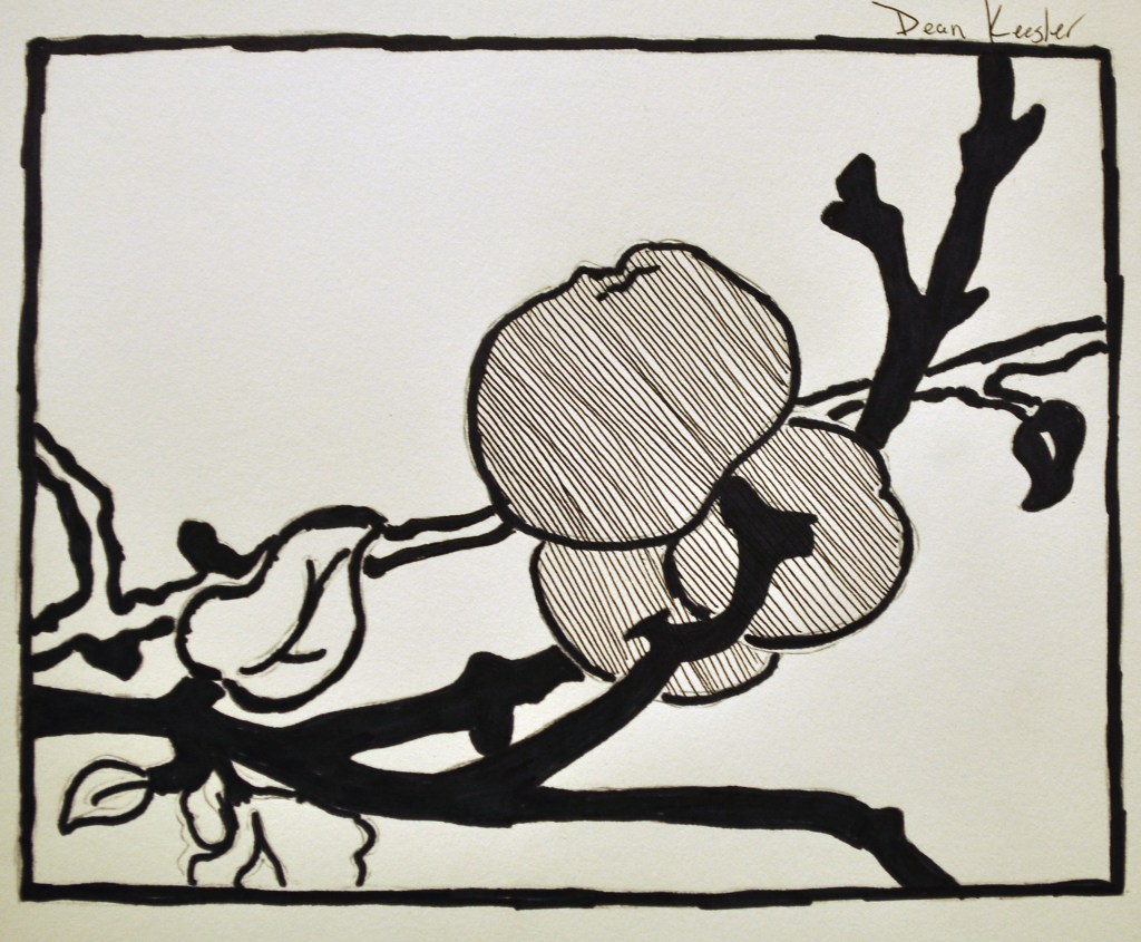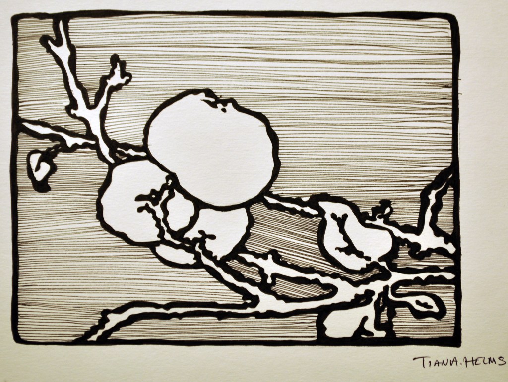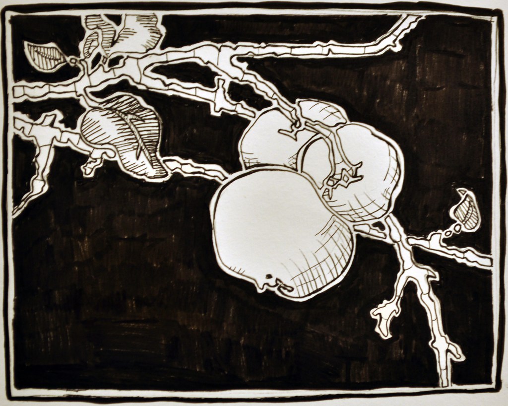 - Next indicate where the 3 values will be. The Black areas vs. the white of the paper. Consider putting the 3rd value in between some of these extremes. The third value could also go on one of the apples or part of the branch. Be creative and make a solid design with the 3 values.