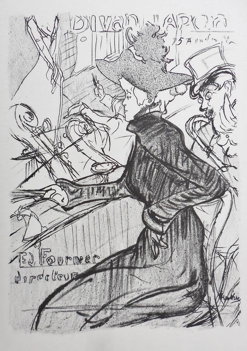 Lithography had its limitations- the stones were limited in size- the larger the stone the heavier it was and harder to transport from the artist’s studio to the print shop. Secondly, each color that you added to the design need to be applied to a different stone with the “Key” stone presenting the black drawing. All these stones needed to be registered to align image, color, drawing and text. But limitation has its power- the limited range of color allowed these artists to use color to focus the eye and concentrate on the intent of the message. These colors, usually 3 or less, created the environment in which a simple bold statement of 1-3 colors created a base upon which a monochrome or muted tone upper drawing created contrast and visual excitement. Such brevity of technique allowed these posters to stand out and form an iconography of image, creating a new graphic vocabulary that influenced graphic design into the 20th and 21st century.