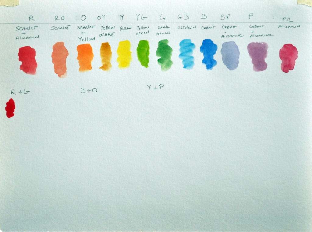 In this assignment, I would like you to create a color sheet demonstrating the types of mixes you can achieve with the watercolors that are in the kit. Please follow my schematic chart. This chart will present you with some choices to make. This chart will present you with some choices that you will need to mix. I will list the combinations I would like you to try. We will place our top line of colors in order- this will coincide with the light spectrum. Think of a rainbow. Even though every color has its inherent value, this will be something we can manipulate through the use of more or less water. We will never use the white unless I indicate to do so.