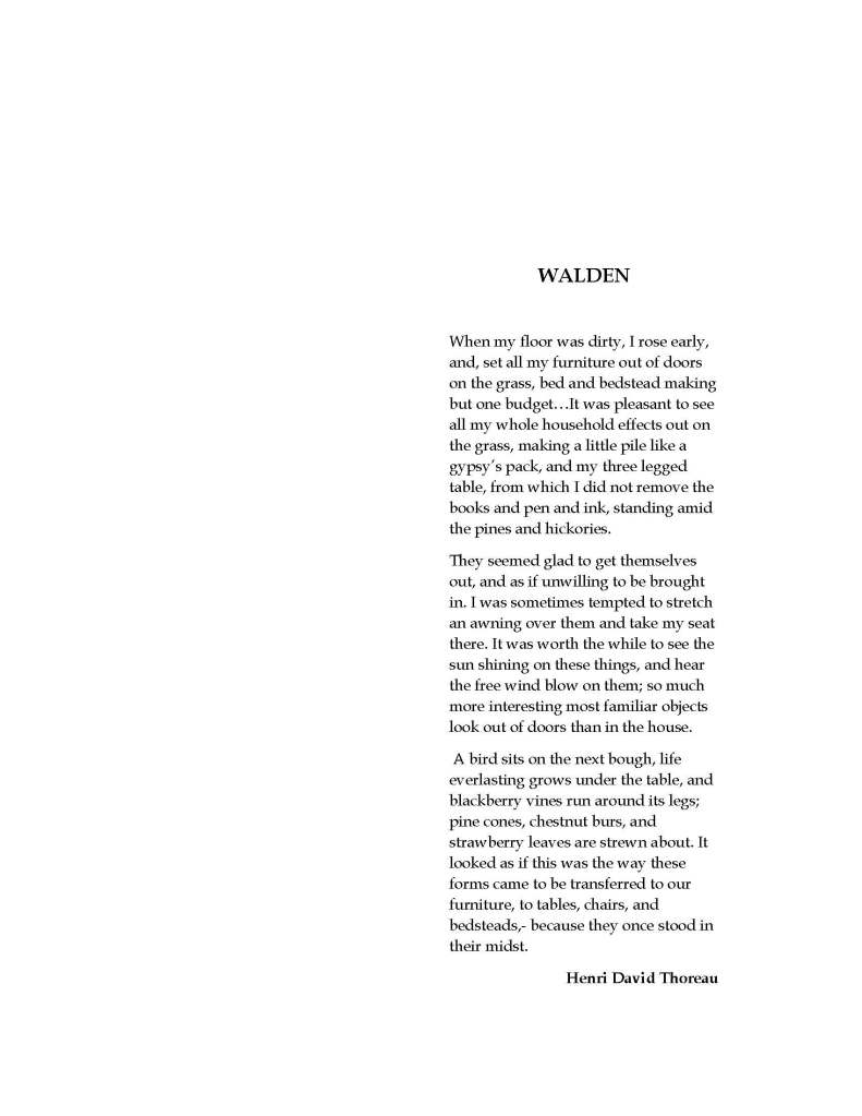 I have indicated some of the objects that may be incorporated as I have read the entire book and indicate those objects that reoccur throughout. Reflect on the time period 1845-1854 [Thoreau’s stay at Walden until he published the actual book derived from that stay]. Look at furniture from that time. His father sold pencils, so any furniture that he had was simple and most likely, not ornate [Although, he did attend Harvard, so he was culturally acute]. Remember it is summertime and takes place early in the morning (as he indicates he finishes before most people have breakfast). Remember he is also a writer, so you may use books, paper, inkwell, quill pen.