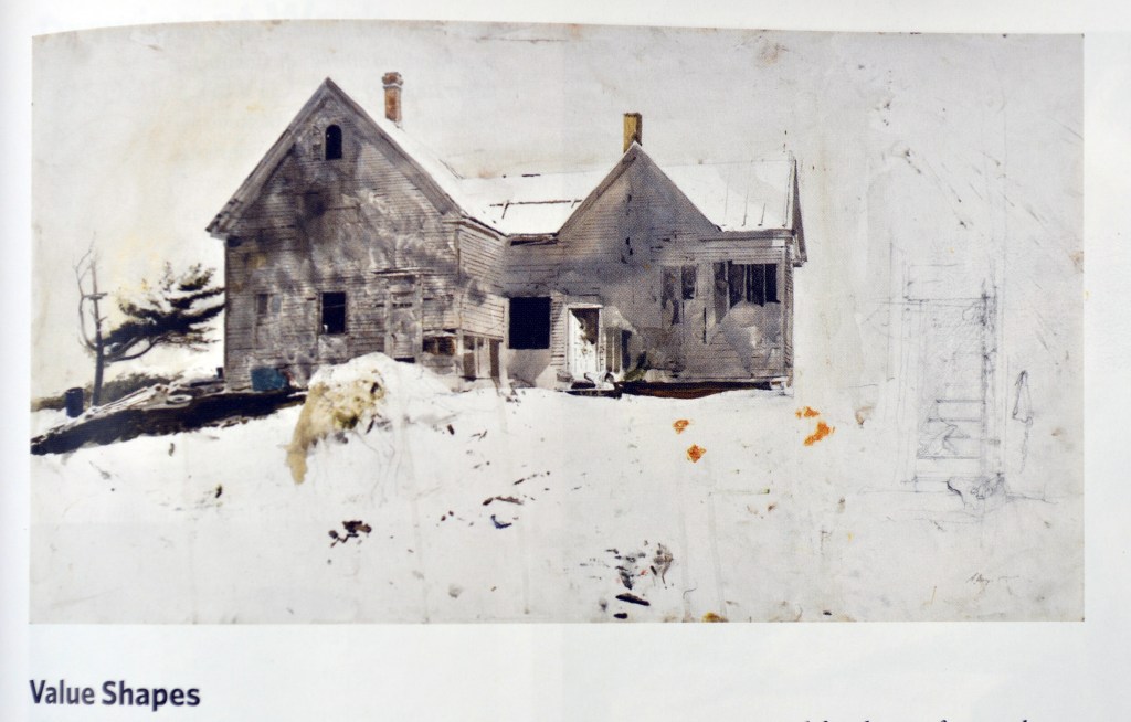 As we begin to work on this project, I will point out different ideas and techniques to help you create a strong composition to support the passage from “Walden”. The first idea is one that we have already been working on. It is composing the large masses, whether it is like a 3 value Notan or a color composition or a combination of both. So, this week we are studying how to think about the large masses that will be in our composition.