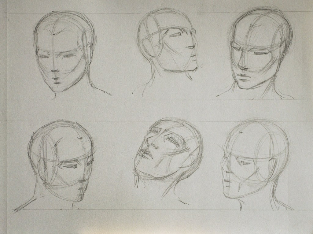 Take your pad horizontally and create 2 rows that are 4″ high. There will be an inch at the top, followed by a 4″ row, followed by a 1″ space, followed by another 4″ row, with a remaining 1-1.25″ space at the bottom. The spaces in between are less important than the 4″ rows. These 4″ rows will allow you to get all your heads relatively the same size. Most illustrators tend to use some sort of grid system to keep proportions the same as they build an image. Next, sketch 6 head studies using the Loomis Method on head construction. Choose different positions of the head, rotating it as well as raising or lowering the chin. This will give you practice with basic head construction. The heads should be about 4″. They must include the neck. When I worked on my sheet, I created the initial circles to take up about 2/3 of that 4″ space. This left me room to build the jaw and neck.