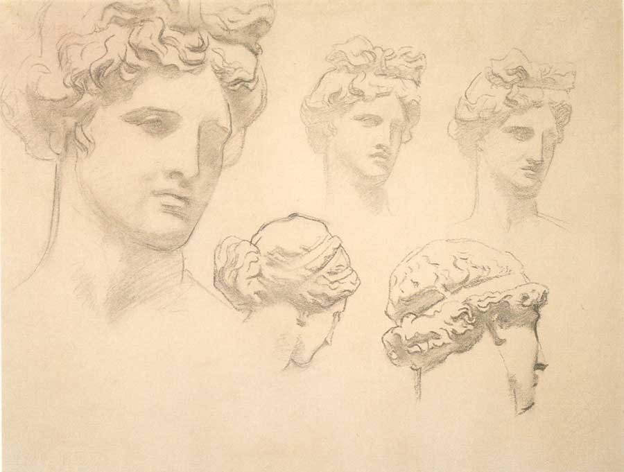 In this lesson, I will go over the process of copying the Gibson and Aphrodite heads and examine some ways to deal with the more difficult details that have to be rendered. I will also discuss laying in the shape/pattern of the large masses of the shadows first, then add the respective values. In the Gibson head we will leave small patterns of white in the mass of the hair. And in the Greek head we will simplify the shadow shapes in the schematic design in order to give a more unified feel to our drawing. I have some examples of John Singer Sargent’s copies of Greek heads and figures for reference.