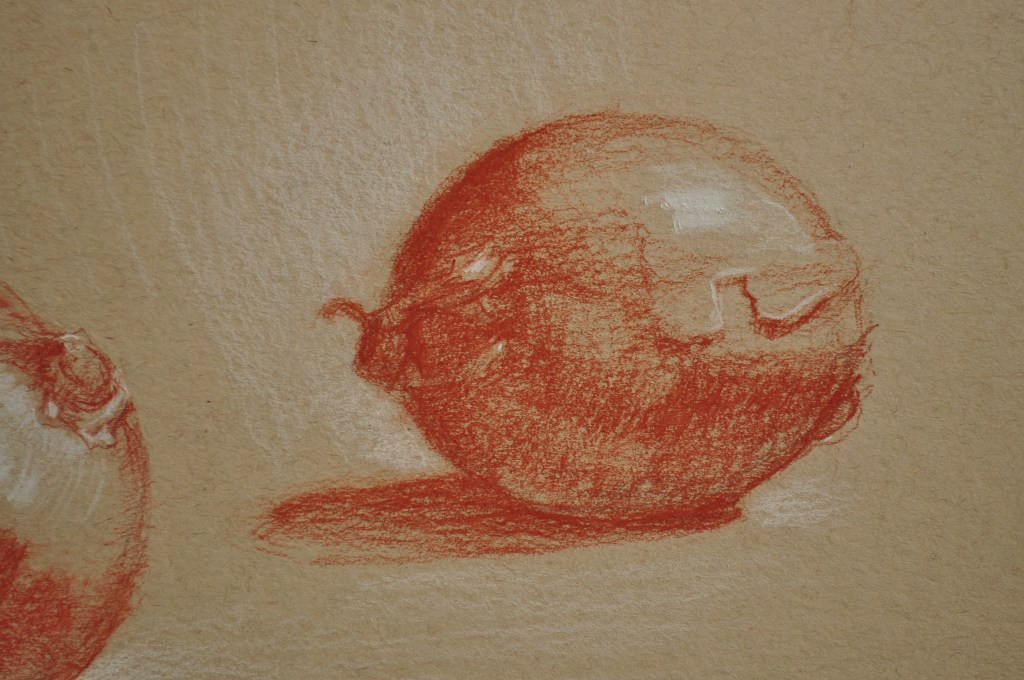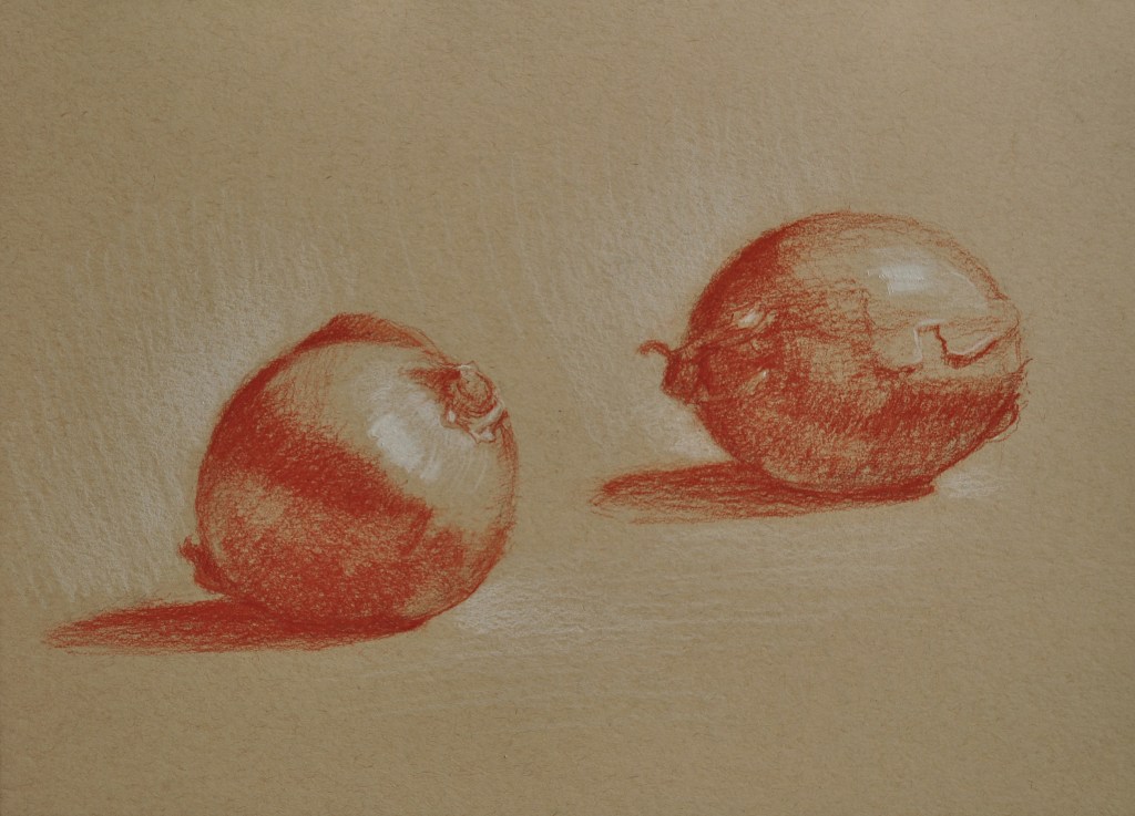 - Secondly, sketch your 2 onions in pencil very lightly (HB or 2B). Check your drawing by making comparisons- vertical, horizontal, proportional. Re-draw and correct any mistakes. Lighten the graphite lines because conte will not go over the graphite easily.