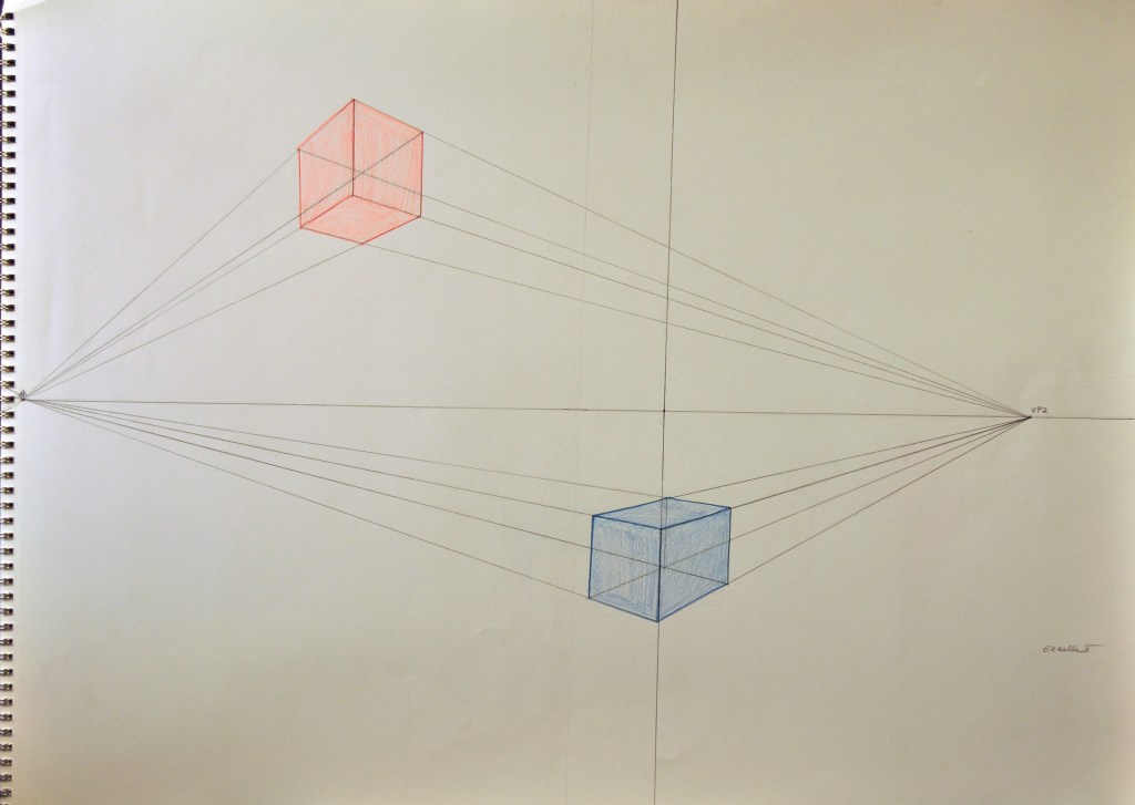 In this lesson we will be exploring 1pt. and 2 pt. perspective. Important: The perspective exercise I usually demonstrate on the board and the class follows along.These videos were created so that you can follow along, step-by-step through the drawing exercise. I have created these videos in two episodes so that you can watch a video, take a pause and draw on your sheet of paper and then continue watching the video. The 1 pt. and 2 pt. exercises here need to be completed and uploaded in order to receive credit.
