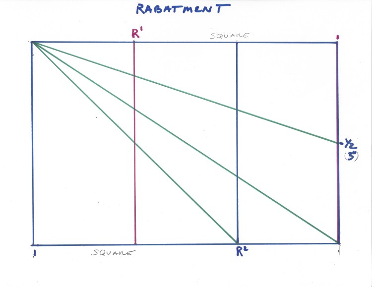 - On the first rectangle: Next, create the diagonals from the upper left corner- 1 to the lower right corner; 1 to the vertical that forms the rabatment square; 1 to the half-way point on the 6″ side. This should replicate your view finder.