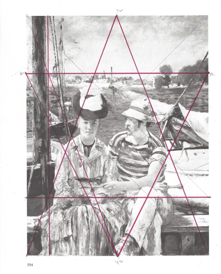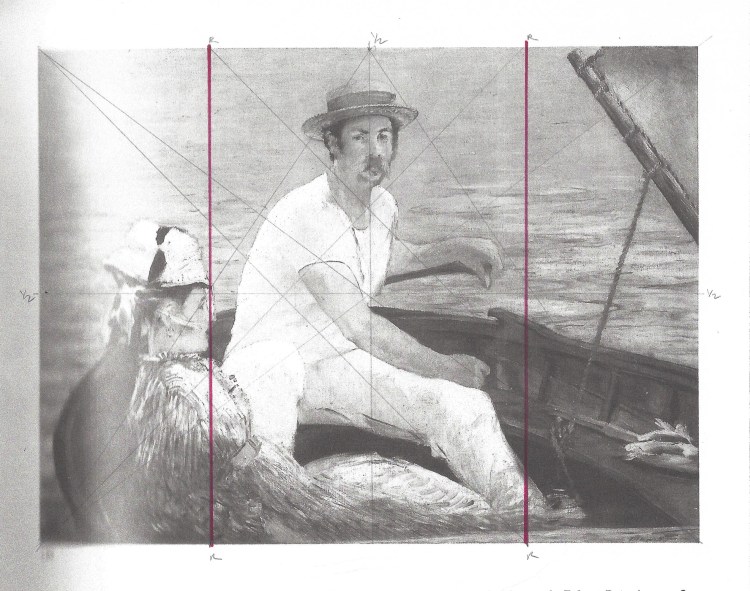 Rabatment refers to the rotation of the short side of the rectangle on to the longer side. This creates a square inside of the rectangle from both ends. It also produces a series of vertical and diagonal lines. These diagonals cut across the full rectangle and the square within the rectangle. The compositional system of Rabatment emphasizes a feeling of dynamic movement. Whereas, the Division of Thirds emphasizes balance and stability. Rabatment has been used by artists as diverse as Manet to Kandinsky, realism to abstract expressionism. Rabatment is an under-lying framework that ties an image together while emphasizing a dynamic feeling of movement based on the diagonal.