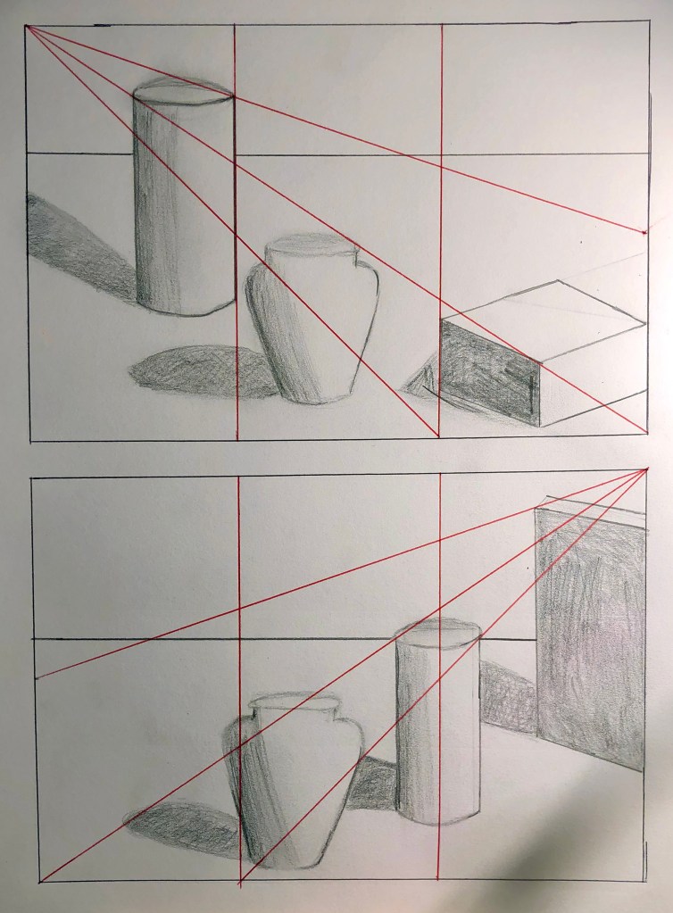 - Next, draw two different compositions within these rectangles. First sketch lightly to place your objects within the framework. Next, put down the view finder and correctly sketch your objects, making comparisons. Draw in basic shadow shapes and cast shadows. Add values.